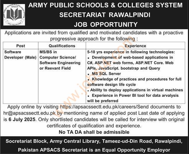 If you are searching for government jobs in Punjab or specifically IT jobs in Rawalpindi, this opening at the Army Public Schools & Colleges System Secretariat is an excellent option. It offers a full-time, secure position with growth potential in the IT field, contributing to the education sector. Check the official advertisement and submit your application before the deadline to take advantage of this opportunity.