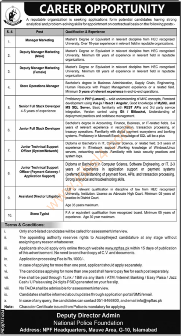 The National Police Foundation Islamabad is offering many latest govt jobs. Here are the job titles you can apply for: