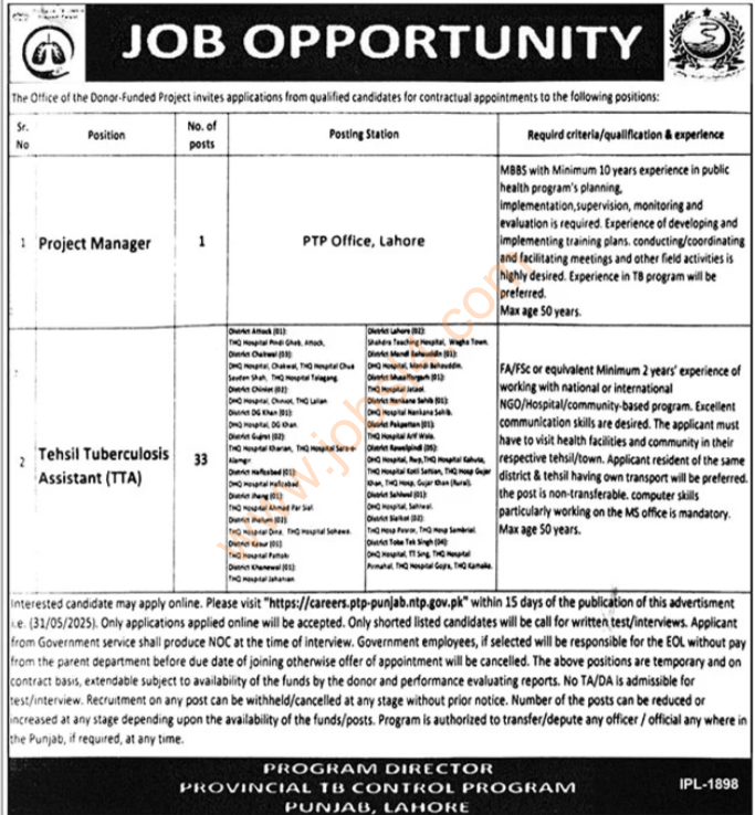 The job is offered by the Provincial TB Control Program in Lahore, Punjab, Pakistan. Job Type: Full-Time Job Area: Government Job Industry: Management Posted On: 16 May, 2025 Last Date to Apply: 31 May, 2025 (or as shown in the newspaper ad) Newspaper: The News