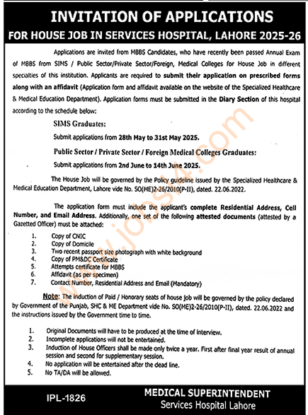 Follow these simple steps to apply for the Services Hospital Lahore House Jobs 2025:
